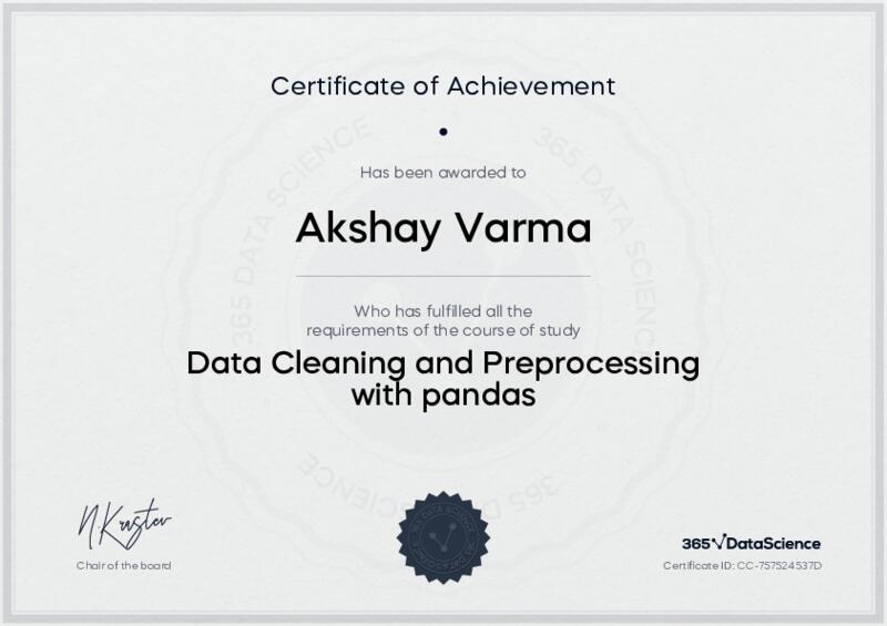 This user has been awarded the Data Cleaning and Preprocessing with pandas Certificate for successfully completing the course exam. Holding this certificate demonstrates their proficiency on the topic and signifies they are qualified to apply their newly acquired expertise in the fields of data analytics and data science.