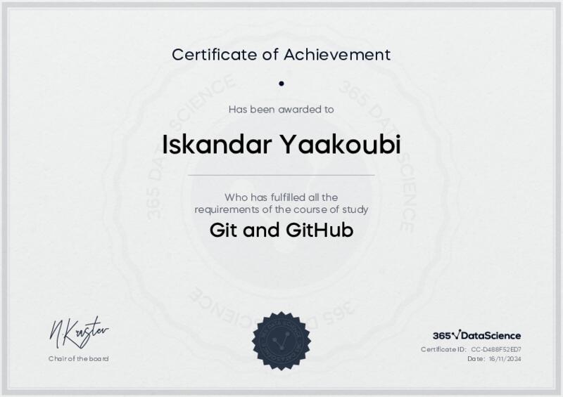This user has been awarded the Git and GitHub Certificate for successfully completing the course exam. Holding this certificate demonstrates their proficiency on the topic and signifies they are qualified to apply their newly acquired expertise in the fields of data analytics and data science.