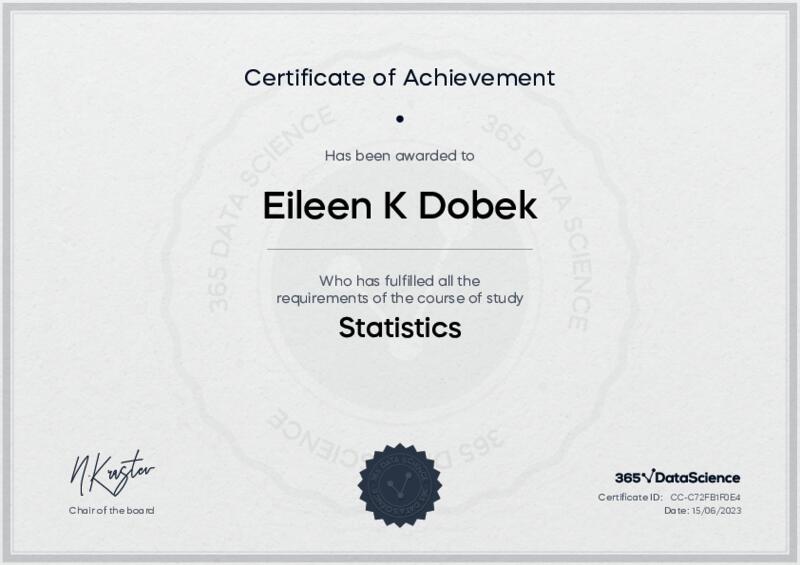 This user has been awarded the Statistics Certificate for successfully completing the course exam. Holding this certificate demonstrates their proficiency on the topic and signifies they are qualified to apply their newly acquired expertise in the fields of data analytics and data science.