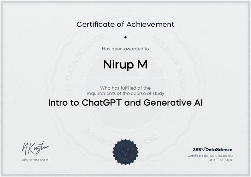 This user has been awarded the Intro to ChatGPT and Generative AI Certificate for successfully completing the course exam. Holding this certificate demonstrates their proficiency on the topic and signifies they are qualified to apply their newly acquired expertise in the fields of data analytics and data science.