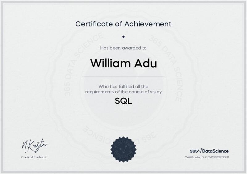 This user has been awarded the SQL Certificate for successfully completing the course exam. Holding this certificate demonstrates their proficiency on the topic and signifies they are qualified to apply their newly acquired expertise in the fields of data analytics and data science.
