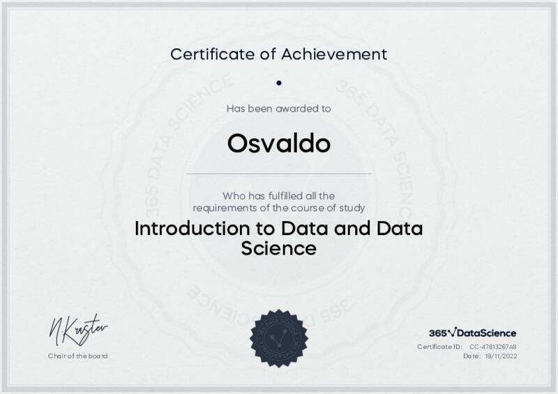This user has been awarded the Introduction to Data and Data Science Certificate for successfully completing the course exam. Holding this certificate demonstrates their proficiency on the topic and signifies they are qualified to apply their newly acquired expertise in the fields of data analytics and data science.
