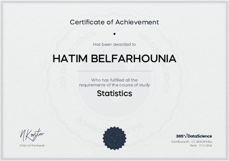 This user has been awarded the Statistics Certificate for successfully completing the course exam. Holding this certificate demonstrates their proficiency on the topic and signifies they are qualified to apply their newly acquired expertise in the fields of data analytics and data science.