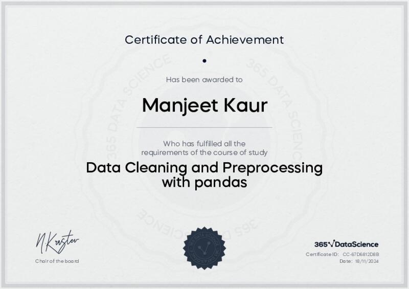 This user has been awarded the Data Cleaning and Preprocessing with pandas Certificate for successfully completing the course exam. Holding this certificate demonstrates their proficiency on the topic and signifies they are qualified to apply their newly acquired expertise in the fields of data analytics and data science.
