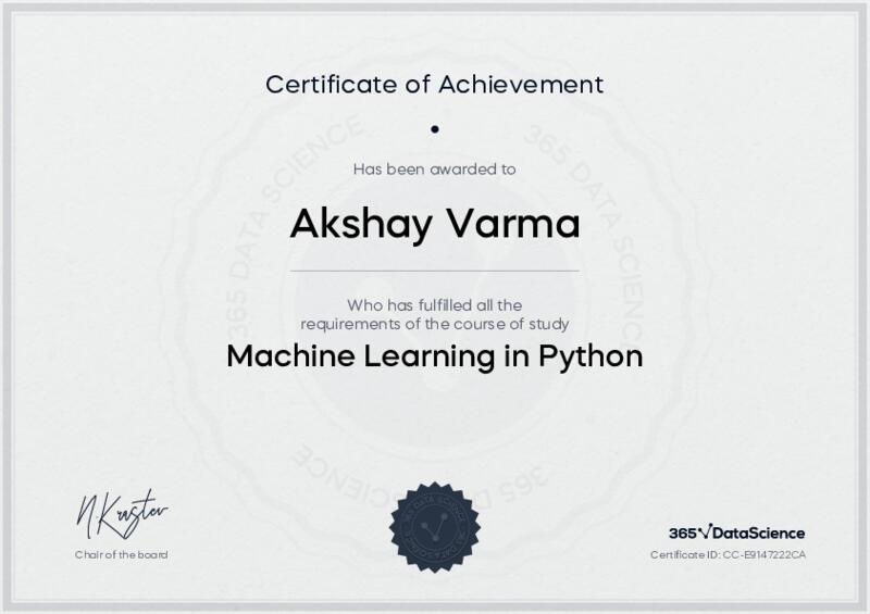 This user has been awarded the Machine Learning in Python Certificate for successfully completing the course exam. Holding this certificate demonstrates their proficiency on the topic and signifies they are qualified to apply their newly acquired expertise in the fields of data analytics and data science.