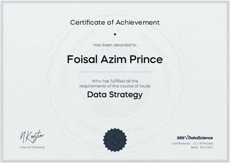 This user has been awarded the Data Strategy Certificate for successfully completing the course exam. Holding this certificate demonstrates their proficiency on the topic and signifies they are qualified to apply their newly acquired expertise in the fields of data analytics and data science.