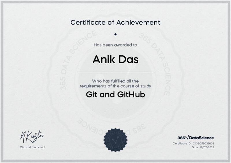This user has been awarded the Git and GitHub Certificate for successfully completing the course exam. Holding this certificate demonstrates their proficiency on the topic and signifies they are qualified to apply their newly acquired expertise in the fields of data analytics and data science.