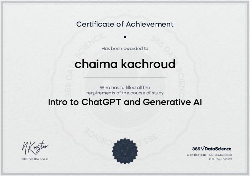 This user has been awarded the Intro to ChatGPT and Generative AI Certificate for successfully completing the course exam. Holding this certificate demonstrates their proficiency on the topic and signifies they are qualified to apply their newly acquired expertise in the fields of data analytics and data science.