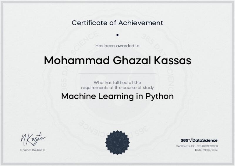 This user has been awarded the Machine Learning in Python Certificate for successfully completing the course exam. Holding this certificate demonstrates their proficiency on the topic and signifies they are qualified to apply their newly acquired expertise in the fields of data analytics and data science.