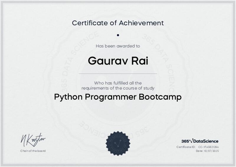 This user has been awarded the Python Programmer Bootcamp Certificate for successfully completing the course exam. Holding this certificate demonstrates their proficiency on the topic and signifies they are qualified to apply their newly acquired expertise in the fields of data analytics and data science.