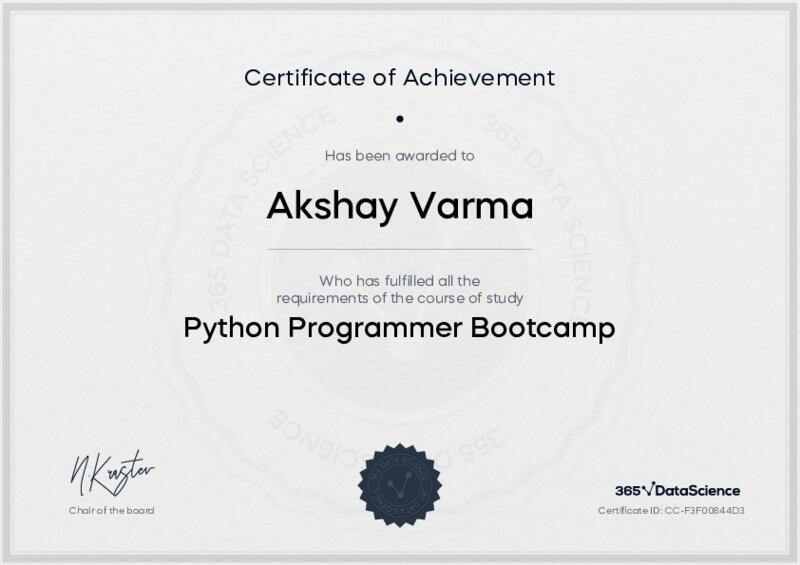 This user has been awarded the Python Programmer Bootcamp Certificate for successfully completing the course exam. Holding this certificate demonstrates their proficiency on the topic and signifies they are qualified to apply their newly acquired expertise in the fields of data analytics and data science.