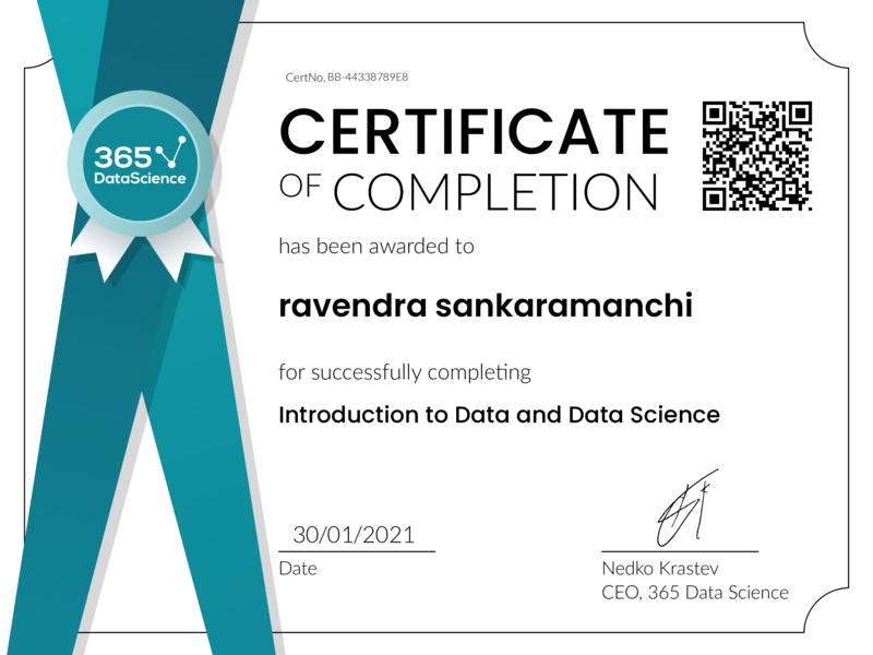 Congratulations! You have been awarded the 365 Data Science Certificate for successfully completing this course. Holding this certificate demonstrates your proficiency on the topic and your ability to apply your newly acquired expertise in the fields of data analytics and data science with confidence.