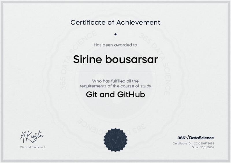 This user has been awarded the Git and GitHub Certificate for successfully completing the course exam. Holding this certificate demonstrates their proficiency on the topic and signifies they are qualified to apply their newly acquired expertise in the fields of data analytics and data science.