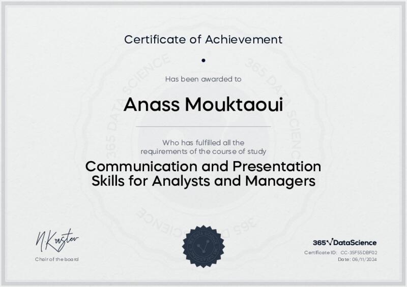 This user has been awarded the Communication and Presentation Skills for Analysts and Managers Certificate for successfully completing the course exam. Holding this certificate demonstrates their proficiency on the topic and signifies they are qualified to apply their newly acquired expertise in the fields of data analytics and data science.