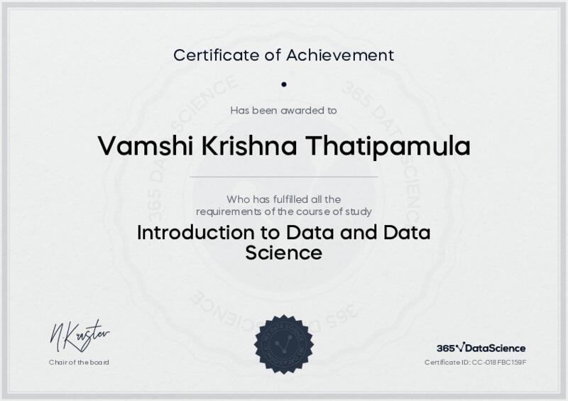 This user has been awarded the Introduction to Data and Data Science Certificate for successfully completing the course exam. Holding this certificate demonstrates their proficiency on the topic and signifies they are qualified to apply their newly acquired expertise in the fields of data analytics and data science.
