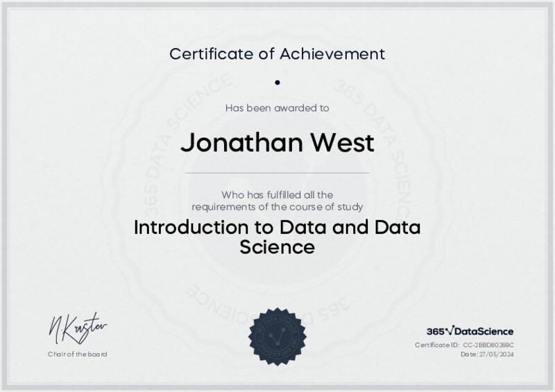 This user has been awarded the Introduction to Data and Data Science Certificate for successfully completing the course exam. Holding this certificate demonstrates their proficiency on the topic and signifies they are qualified to apply their newly acquired expertise in the fields of data analytics and data science.