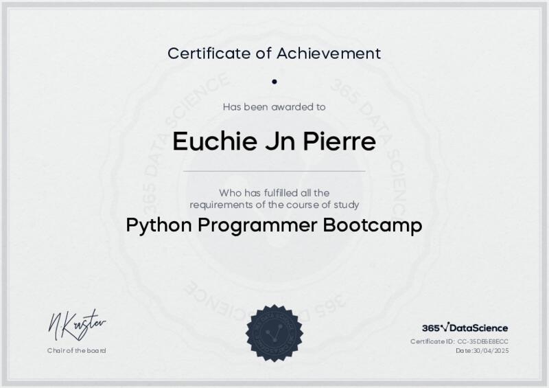 This user has been awarded the Python Programmer Bootcamp Certificate for successfully completing the course exam. Holding this certificate demonstrates their proficiency on the topic and signifies they are qualified to apply their newly acquired expertise in the fields of data analytics and data science.