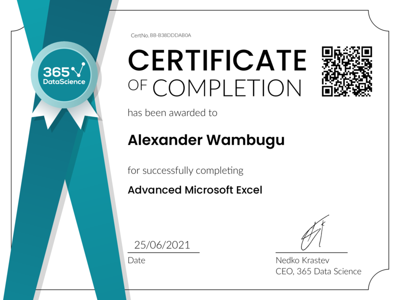 Congratulations! You have been awarded the 365 Data Science Certificate for successfully completing this course. Holding this certificate demonstrates your proficiency on the topic and your ability to apply your newly acquired expertise in the fields of data analytics and data science with confidence.