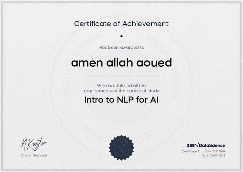 This user has been awarded the Intro to NLP for AI Certificate for successfully completing the course exam. Holding this certificate demonstrates their proficiency on the topic and signifies they are qualified to apply their newly acquired expertise in the fields of data analytics and data science.