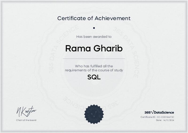 This user has been awarded the SQL Certificate for successfully completing the course exam. Holding this certificate demonstrates their proficiency on the topic and signifies they are qualified to apply their newly acquired expertise in the fields of data analytics and data science.