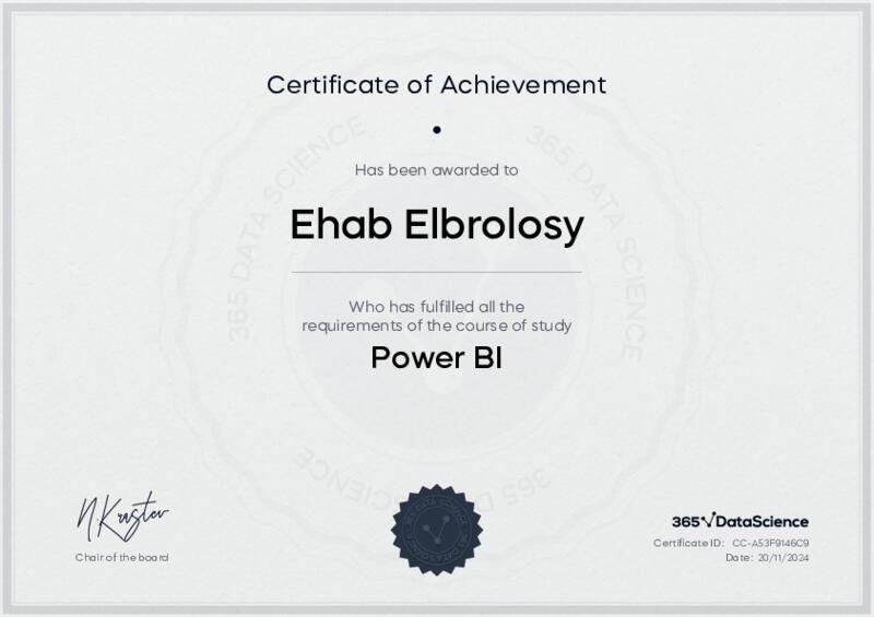 This user has been awarded the Power BI Certificate for successfully completing the course exam. Holding this certificate demonstrates their proficiency on the topic and signifies they are qualified to apply their newly acquired expertise in the fields of data analytics and data science.