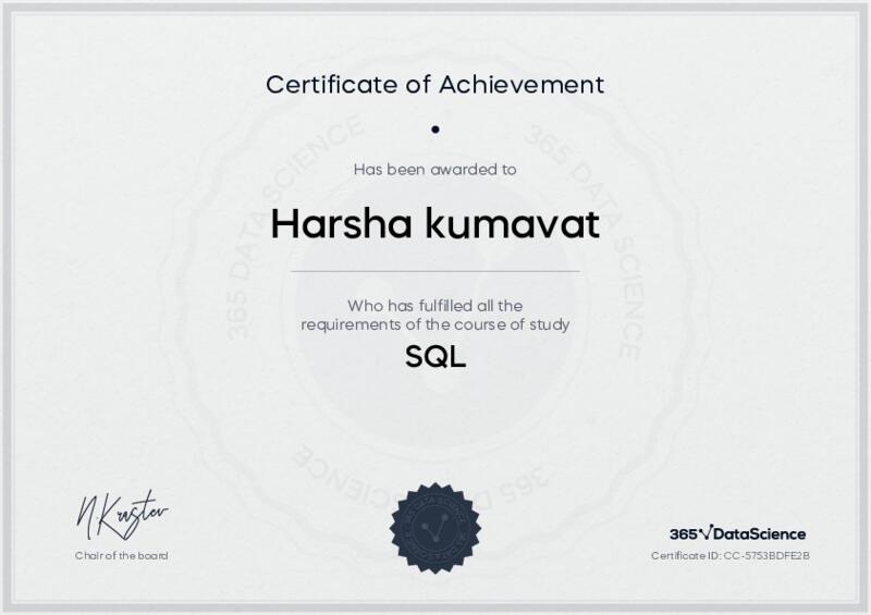 This user has been awarded the SQL Certificate for successfully completing the course exam. Holding this certificate demonstrates their proficiency on the topic and signifies they are qualified to apply their newly acquired expertise in the fields of data analytics and data science.