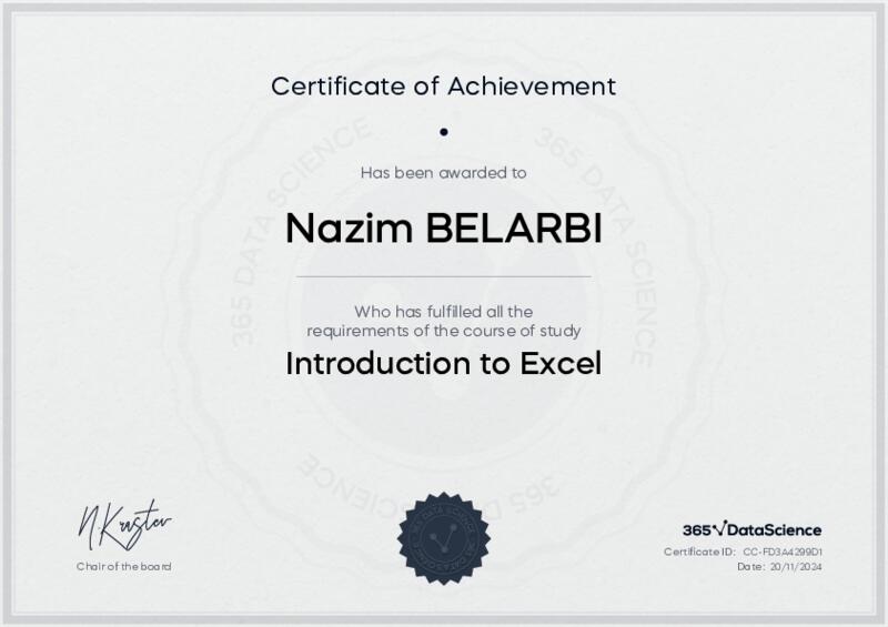 This user has been awarded the Introduction to Excel Certificate for successfully completing the course exam. Holding this certificate demonstrates their proficiency on the topic and signifies they are qualified to apply their newly acquired expertise in the fields of data analytics and data science.