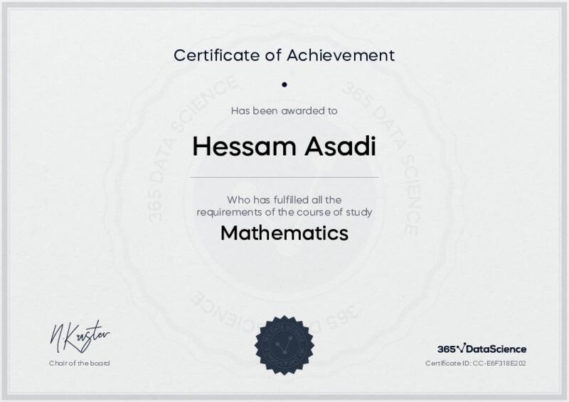 This user has been awarded the Mathematics Certificate for successfully completing the course exam. Holding this certificate demonstrates their proficiency on the topic and signifies they are qualified to apply their newly acquired expertise in the fields of data analytics and data science.