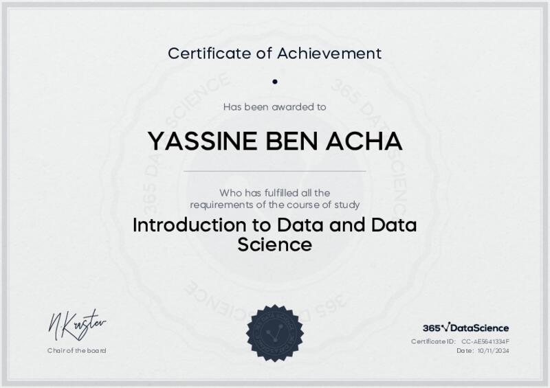 This user has been awarded the Introduction to Data and Data Science Certificate for successfully completing the course exam. Holding this certificate demonstrates their proficiency on the topic and signifies they are qualified to apply their newly acquired expertise in the fields of data analytics and data science.