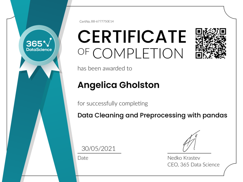 Congratulations! You have been awarded the 365 Data Science Certificate for successfully completing this course. Holding this certificate demonstrates your proficiency on the topic and your ability to apply your newly acquired expertise in the fields of data analytics and data science with confidence.