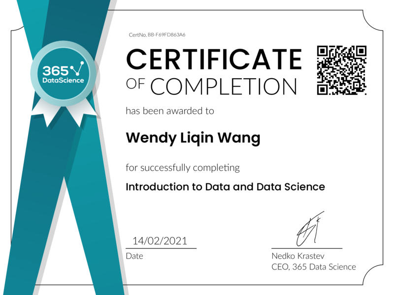 Congratulations! You have been awarded the 365 Data Science Certificate for successfully completing this course. Holding this certificate demonstrates your proficiency on the topic and your ability to apply your newly acquired expertise in the fields of data analytics and data science with confidence.