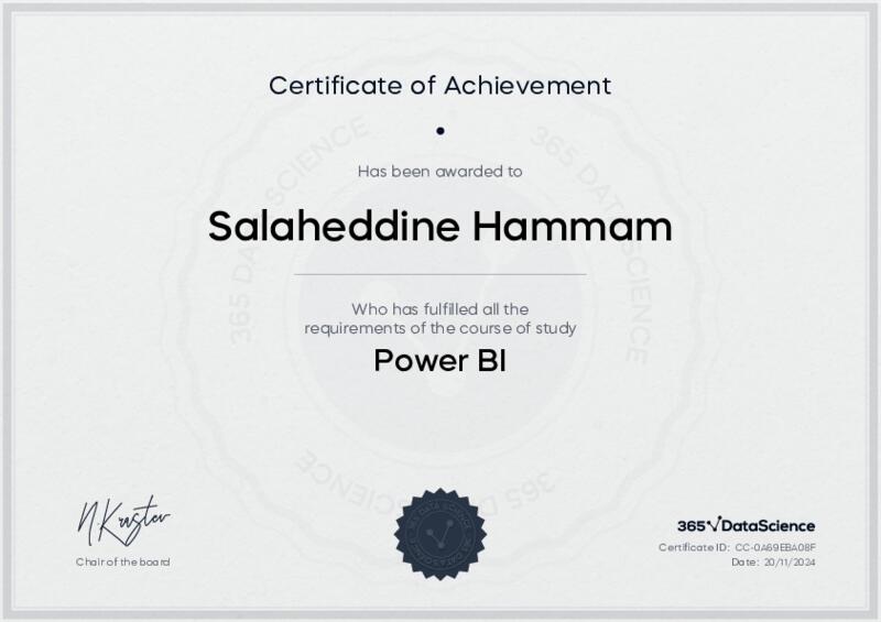 This user has been awarded the Power BI Certificate for successfully completing the course exam. Holding this certificate demonstrates their proficiency on the topic and signifies they are qualified to apply their newly acquired expertise in the fields of data analytics and data science.