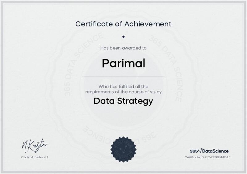 This user has been awarded the Data Strategy Certificate for successfully completing the course exam. Holding this certificate demonstrates their proficiency on the topic and signifies they are qualified to apply their newly acquired expertise in the fields of data analytics and data science.