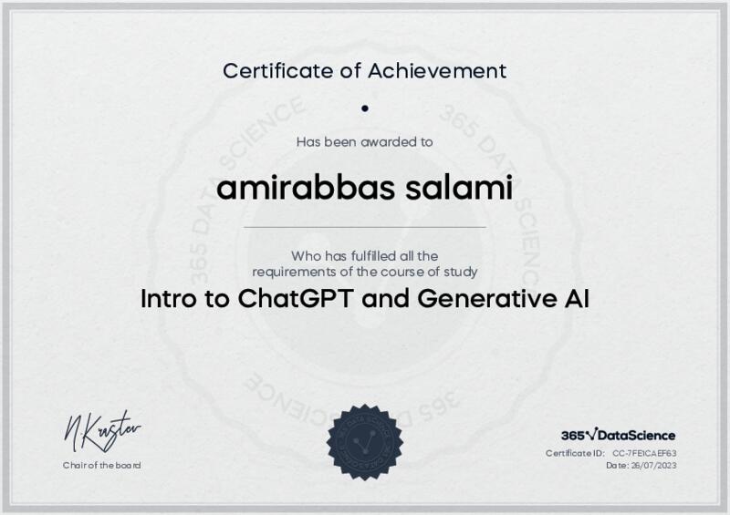This user has been awarded the Intro to ChatGPT and Generative AI Certificate for successfully completing the course exam. Holding this certificate demonstrates their proficiency on the topic and signifies they are qualified to apply their newly acquired expertise in the fields of data analytics and data science.