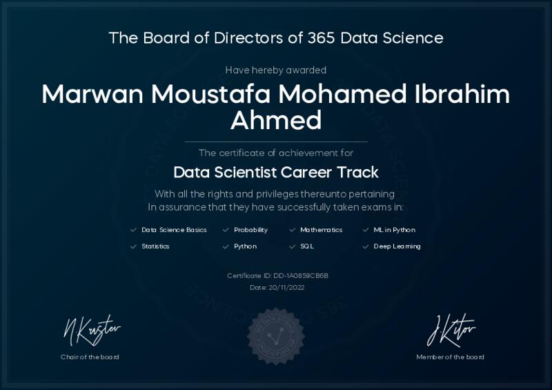 This user has been awarded the Data Scientist Career Track Certificate for successfully completing all courses and assessments. This certificate confirms their technical expertise and professional credibility to work as a data scientist.
