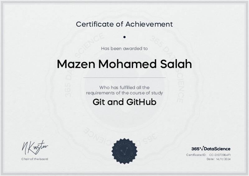 This user has been awarded the Git and GitHub Certificate for successfully completing the course exam. Holding this certificate demonstrates their proficiency on the topic and signifies they are qualified to apply their newly acquired expertise in the fields of data analytics and data science.