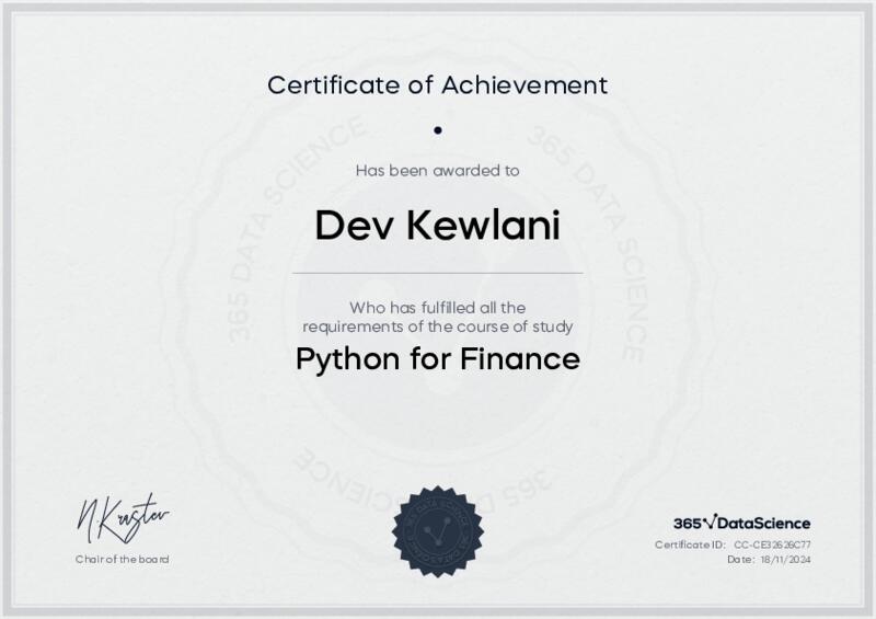 This user has been awarded the Python for Finance Certificate for successfully completing the course exam. Holding this certificate demonstrates their proficiency on the topic and signifies they are qualified to apply their newly acquired expertise in the fields of data analytics and data science.