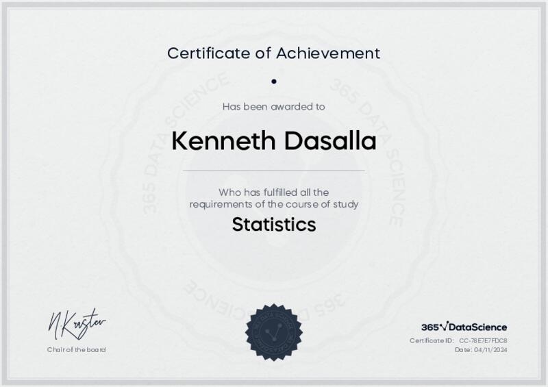 This user has been awarded the Statistics Certificate for successfully completing the course exam. Holding this certificate demonstrates their proficiency on the topic and signifies they are qualified to apply their newly acquired expertise in the fields of data analytics and data science.
