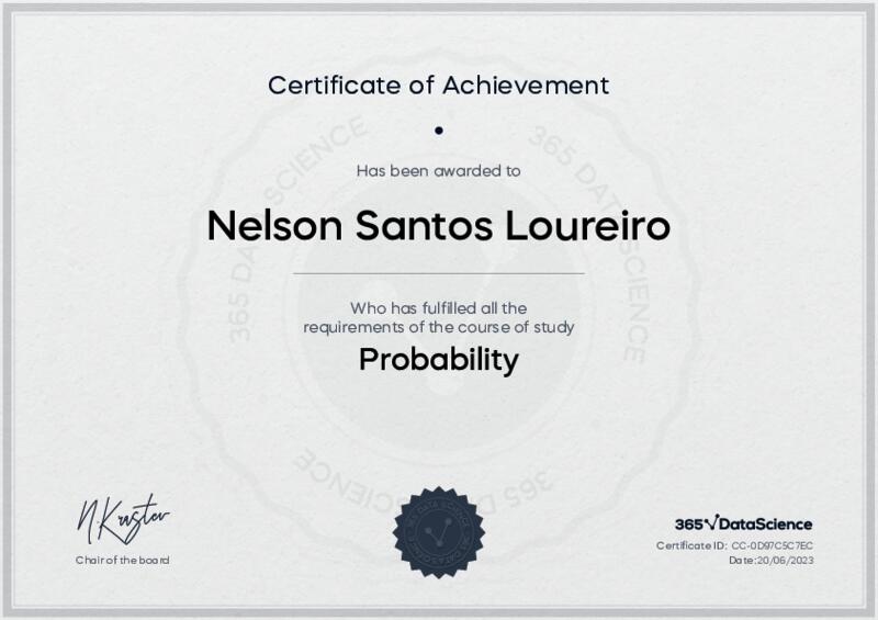 This user has been awarded the Probability Certificate for successfully completing the course exam. Holding this certificate demonstrates their proficiency on the topic and signifies they are qualified to apply their newly acquired expertise in the fields of data analytics and data science.
