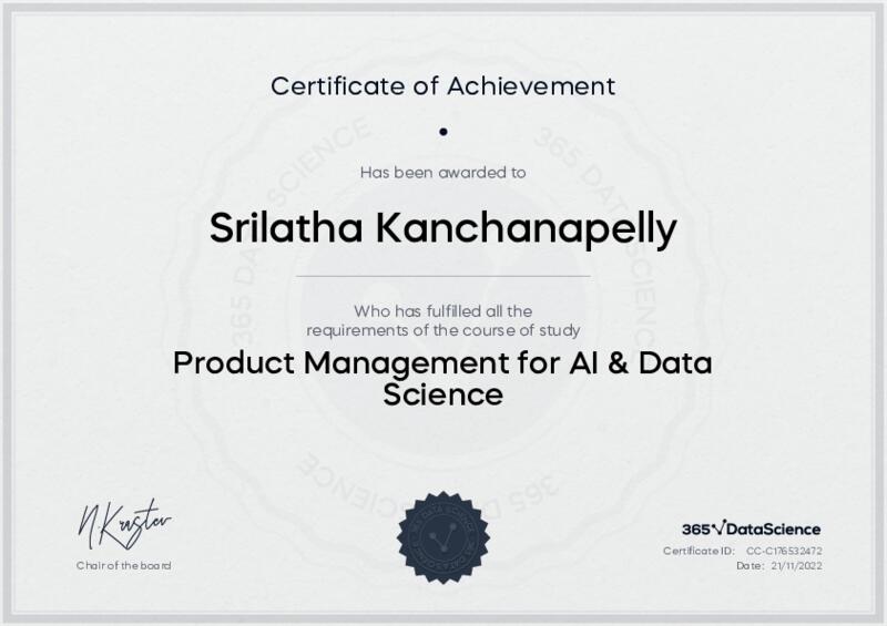 This user has been awarded the Product Management for AI & Data Science Certificate for successfully completing the course exam. Holding this certificate demonstrates their proficiency on the topic and signifies they are qualified to apply their newly acquired expertise in the fields of data analytics and data science.