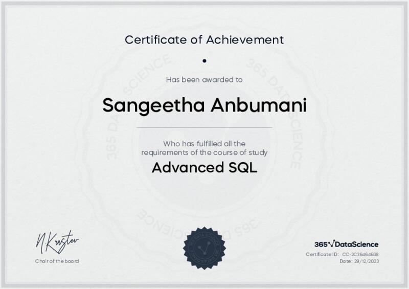 This user has been awarded the Advanced SQL Certificate for successfully completing the course exam. Holding this certificate demonstrates their proficiency on the topic and signifies they are qualified to apply their newly acquired expertise in the fields of data analytics and data science.