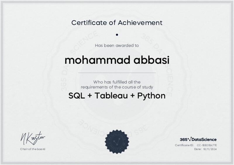 This user has been awarded the SQL + Tableau + Python Certificate for successfully completing the course exam. Holding this certificate demonstrates their proficiency on the topic and signifies they are qualified to apply their newly acquired expertise in the fields of data analytics and data science.