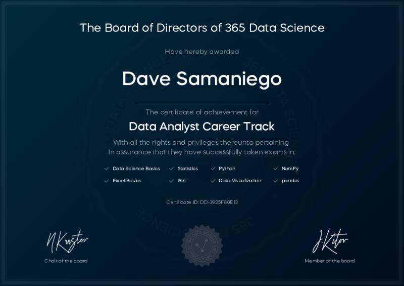 This user has been awarded the Data Analyst Career Track Certificate for successfully completing all courses and assessments. This certificate confirms their technical expertise and professional credibility to work as a data analyst.