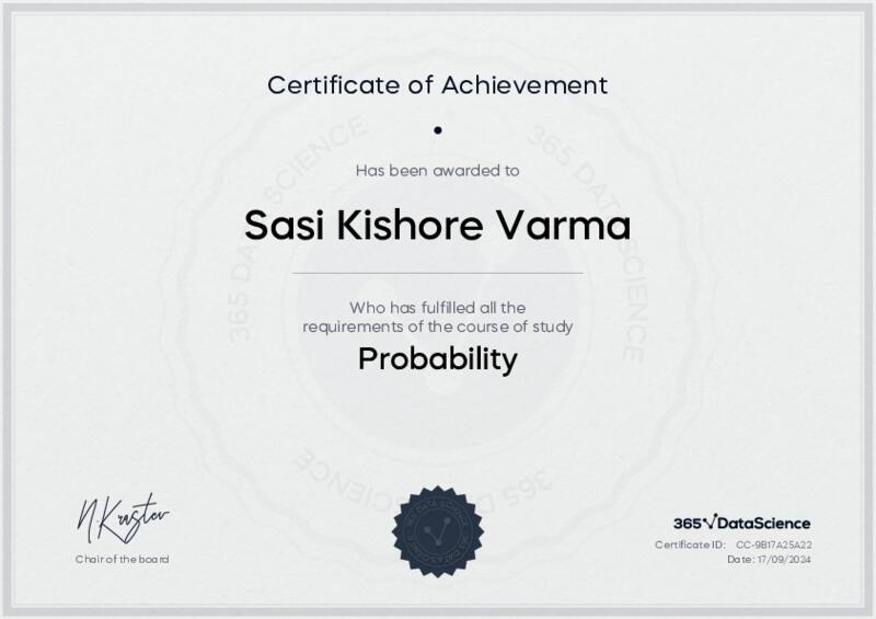 This user has been awarded the Probability Certificate for successfully completing the course exam. Holding this certificate demonstrates their proficiency on the topic and signifies they are qualified to apply their newly acquired expertise in the fields of data analytics and data science.