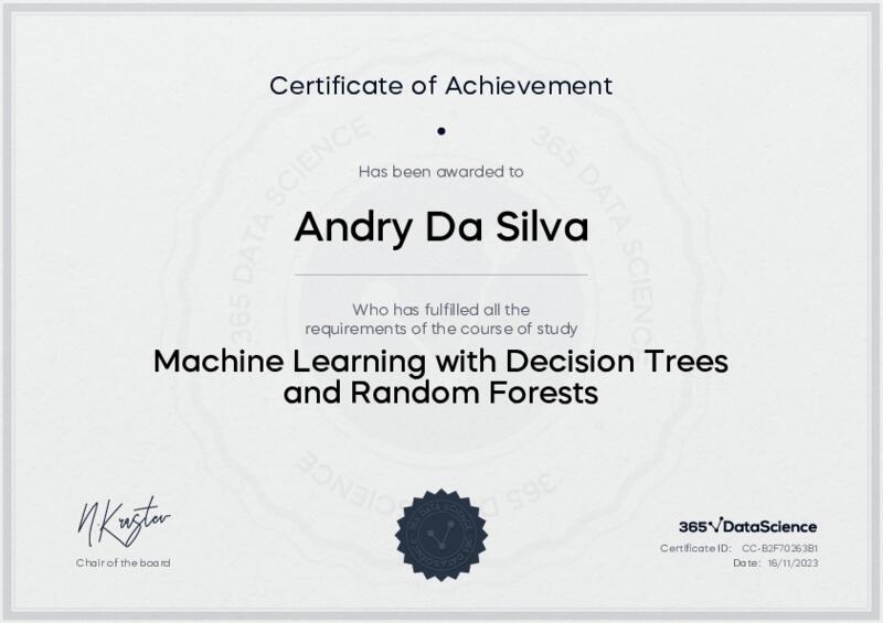 This user has been awarded the Machine Learning with Decision Trees and Random Forests Certificate for successfully completing the course exam. Holding this certificate demonstrates their proficiency on the topic and signifies they are qualified to apply their newly acquired expertise in the fields of data analytics and data science.
