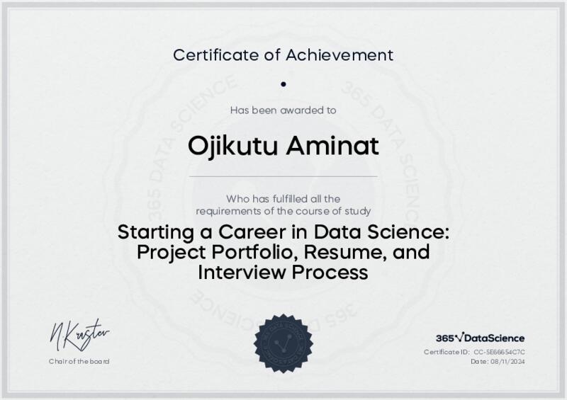 This user has been awarded the Starting a Career in Data Science: Project Portfolio, Resume, and Interview Process Certificate for successfully completing the course exam. Holding this certificate demonstrates their proficiency on the topic and signifies they are qualified to apply their newly acquired expertise in the fields of data analytics and data science.