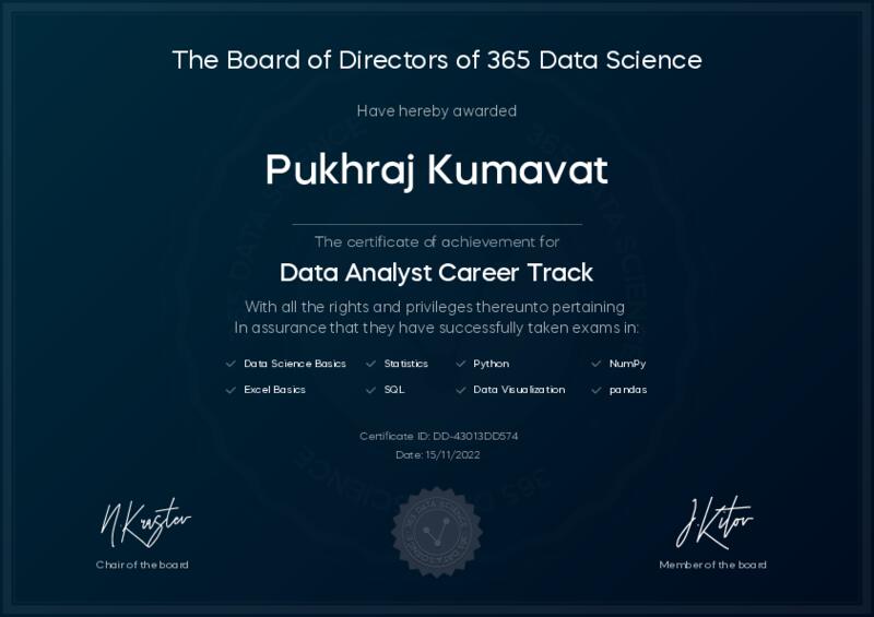 This user has been awarded the Data Analyst Career Track Certificate for successfully completing all courses and assessments. This certificate confirms their technical expertise and professional credibility to work as a data analyst.