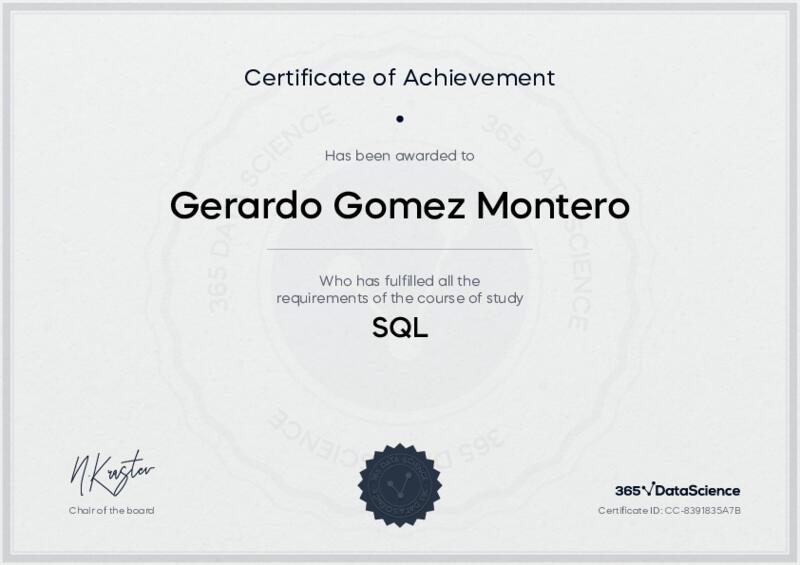 This user has been awarded the SQL Certificate for successfully completing the course exam. Holding this certificate demonstrates their proficiency on the topic and signifies they are qualified to apply their newly acquired expertise in the fields of data analytics and data science.