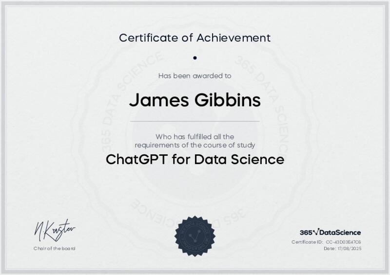 This user has been awarded the ChatGPT for Data Science Certificate for successfully completing the course exam. Holding this certificate demonstrates their proficiency on the topic and signifies they are qualified to apply their newly acquired expertise in the fields of data analytics and data science.