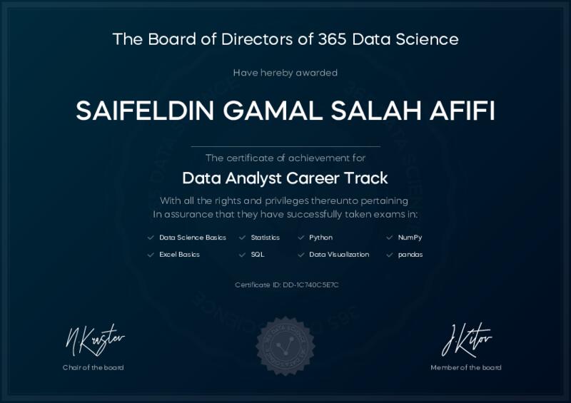 This user has been awarded the Data Analyst Career Track Certificate for successfully completing all courses and assessments. This certificate confirms their technical expertise and professional credibility to work as a data analyst.